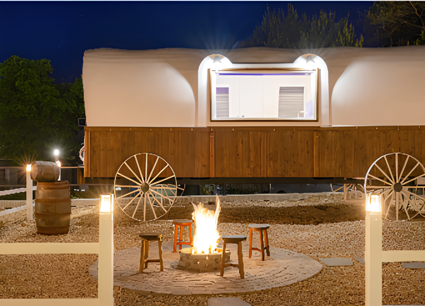 마차를 닮 글램핑 객실은 강을 바라보며 상쾌한 아침을 맞이할 수 있어요. 객실 외부에는 개별 바베큐 테라스가 있고, 가운데에는 캠프파이어를 할 수 있는 화로가 준비되어 있어요. 바베큐 파티를 즐기면서 화로 앞에서 따뜻한 분위기를 느껴보는 건 어떠세요? 겨울에는 담요를 덮고 따뜻한 캠프파이어 분위기에 푹 빠져보는게 어떨까요?
